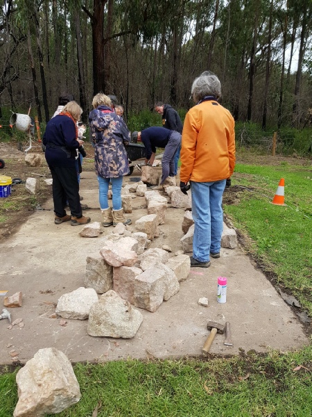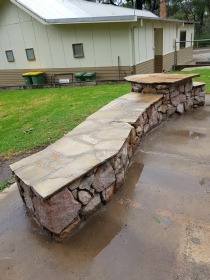 We transformed this ugly concrete slab, remnant from an old toilet block, into a rock feature that can now be used for seating with a table at one end to enjoy the view of the valley beyond the tanks.