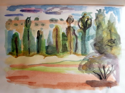 The sketches drawn on this bus trip inspired Colour & Meditation 1989 an exhibition at Roar 2 Gallery in Fitzroy. I was struck by the desolate landscape through inland NSW and heat mirage. They are included in the selection on this page.